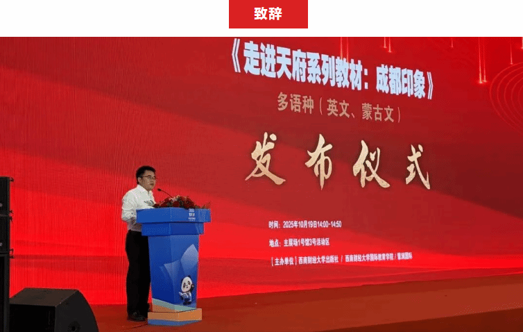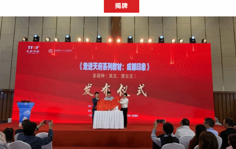 10月19日,《走进天府系列教材:成都印象》(以下简称:《成都印象》)多语种(英文、蒙古文)发布仪式在天府书展主展区隆重举行。西南财经大学出版社社长赵海程,国际教育学院院长袁松阳,慧澜国际总经理陈旭以及出版社、国际教育学院相关代表出席仪式。