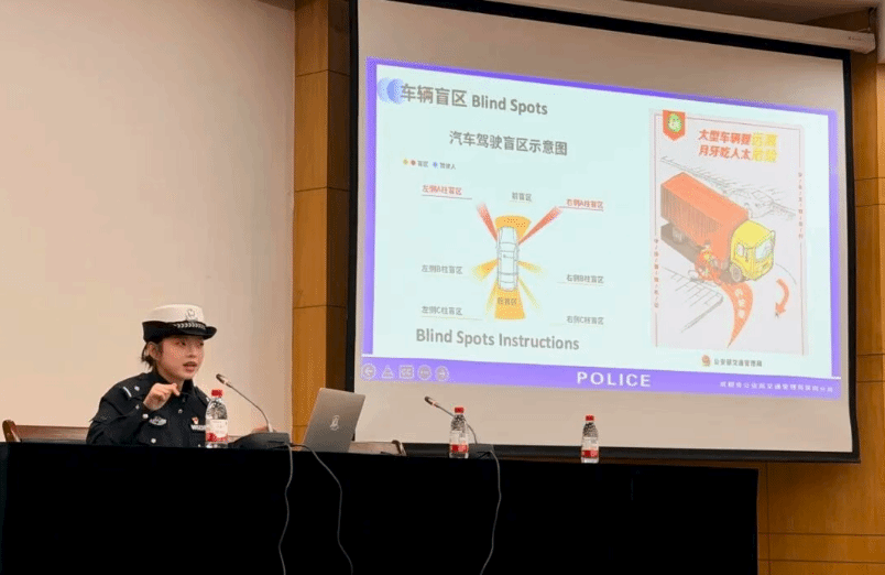 本次讲座围绕 “道路交通安全基本知识”“典型事故案例警示”以及“交通事故现场处置与急救” 三大主题展开。来自成都交警四分局的警官们结合真实案例,深入浅出地讲解了电动车以及汽车规范、行人安全注意事项、交通信号识别等内容,帮助留学生们建立起更加系统的交通安全认知。